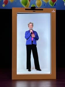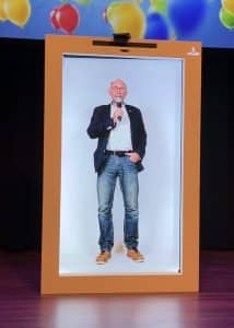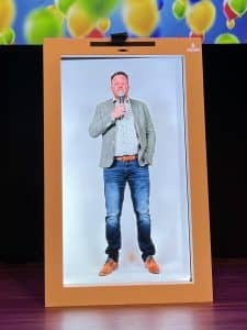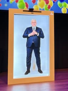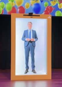 Na een heerlijke en goed verzorgde lunch door Theater De Nieuwe Kolk, opende Eric van Oosterhout, burgermeester van de gemeente Emmen, het middagprogramma van het Recreatiecongres. Recreatieschap Drenthe viert dit jaar het 25-jarig jubileum en daarom blikte Eric met de oud-voorzitters terug op de afgelopen jaren en stonden we met de ondernemers en ambtenaren in de sector stil bij wat we samen al bereikt hebben in Drenthe op het gebied van Recreatie en Toerisme. Eric sprak met de oud-bestuursleden op een wel heel vooruitstrevende manier, namelijk via een hologram!