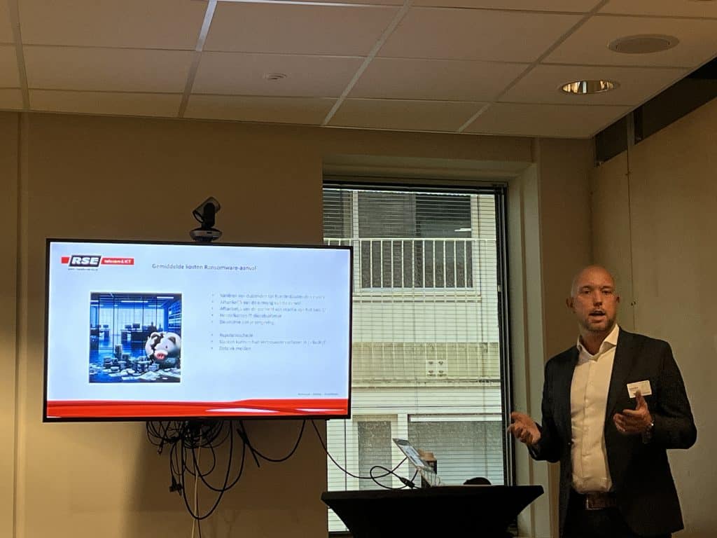 Kevin Bos, ICT-adviseur bij RSE Telecom, vertelde over de mogelijkheden en regelgeving om de cyberveiligheid van organisaties te verbeteren. Hij nam bezoekers mee in de schade van een cyberaanval, maakte bezoekers bewust van de meldplicht na een cyberaanval, informeerde over de verplichte NIS2 wet- en regelgeving en stelde dat de identiteit van ondernemingen het nieuwe veiligheidsfundament tegen cybercriminaliteit is.