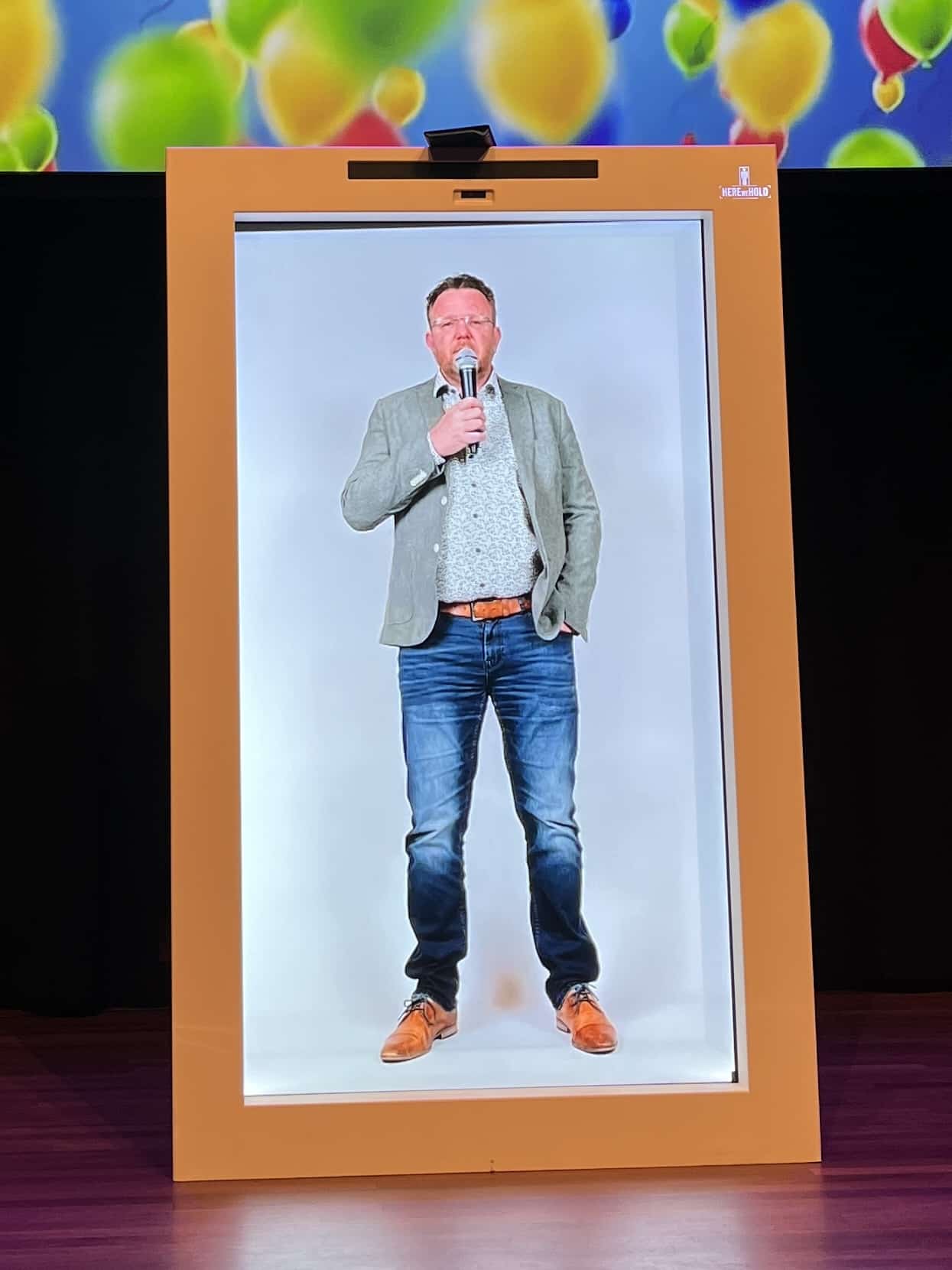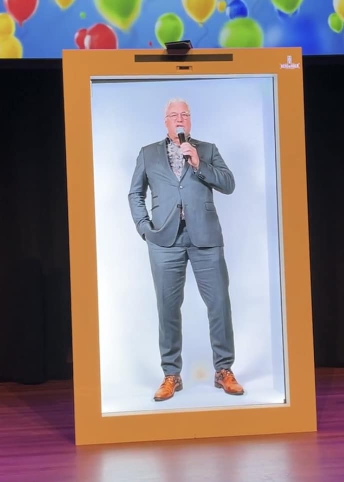 Na een heerlijke en goed verzorgde lunch door Theater De Nieuwe Kolk, opende Eric van Oosterhout, burgermeester van de gemeente Emmen, het middagprogramma van het Recreatiecongres. Recreatieschap Drenthe viert dit jaar het 25-jarig jubileum en daarom blikte Eric met de oud-voorzitters terug op de afgelopen jaren en stonden we met de ondernemers en ambtenaren in de sector stil bij wat we samen al bereikt hebben in Drenthe op het gebied van Recreatie en Toerisme. Eric sprak met de oud-bestuursleden op een wel heel vooruitstrevende manier, namelijk via een hologram!